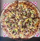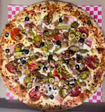 House marinara sauce, Pepperoni, Italian sausage, Canadian bacon, Hamburger, Bacon, Mushroom, Jalapenos, Black olives, Green olives, Sliced pickles, Fresh onion, Fresh bell peppers, Banana peppers & Mozzarella cheese.